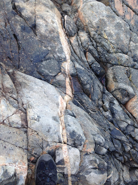 也在附近的沿岸稍探,見有小量針鐵礦及褐鐵礦。還有一些小型岩脈(如石英脈)但無何特別之處,還有很多應是氧化錳見於岩石的節理、裂縫上...